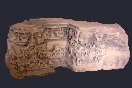 | Description / विवरण | This architectural piece represents dancing human figures in different poses. Floral motifs are carved. It is damaged from one side. |