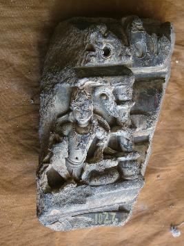 | Description / विवरण | This architectural piece is carved with two handed male figure. Who is sitting in lalitasan posture. It has a mukut carved with high relief. It is also carved with chaitya arch motifs. |