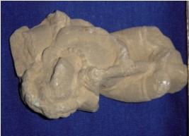 | Description / विवरण | An architectural fragment, depicting a male figurine, facing upwards and resting the head on a couch. He is holding it with the both hands and also wrapped the right leg around it. He has curly hair, a pearl necklace and a short lower garment. The face, right arm, and left leg below the knee are broken. |