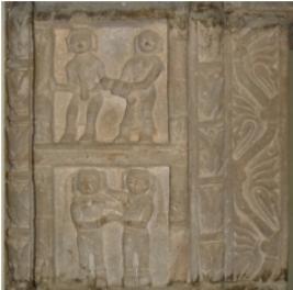 | Description / विवरण | architectural fragment of a door jamb depicting two amorous couples mithuna figures in the niche. There are floral designs on both sides on the niches. |