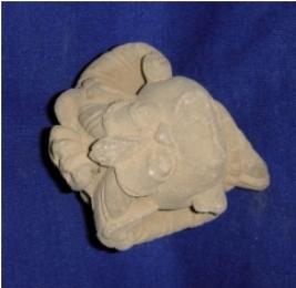 | Description / विवरण | architectural fragment, depicting the head of a mythical animal. Two curved horns, bulging eyes and pearl necklace are visible. The mouth and lower body below the neck are chopped off. Above the head is probably a paw of another animal figurine. |