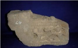 | Description / विवरण | architectural fragment probably part of pillar depicting two warriors in fighting position in the niche. On the above and bottom of it, some architectural design. On the top, there is the depiction of a feet of figurine, which is probably in standing position. |