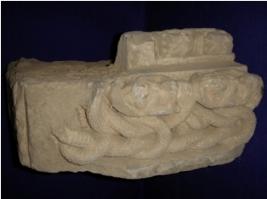 | Description / विवरण | architectural fragment, part of a lintel. depicting two Naga pratima with their bodies coiled together. Both are facing left in Namaskara mudra. Towards the left of it there are depiction of lotus designs. |