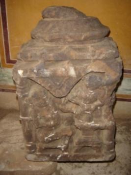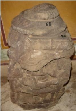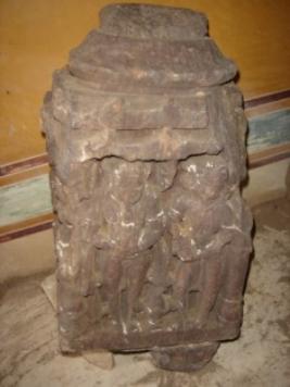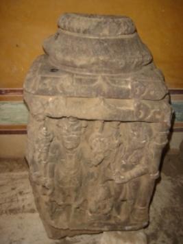 | Description / विवरण | architectural fragment of a pillar with depiction. Front side depicts four armed Sheshshyayi Vishnu, supporting his head with right hand and holding a large lotus flower in left hand. Lakshmi is sitting in left, pressing his feet. In right a bearded male figure is standing in namaskara pose with a female standing on his left, with joined hands and face slightly tilted towards him. In left a male and female are worshiping Shiva Linga, in a pillared niche. In right side, a bearded male is sitting on a stool with Shiv linga placed in front. The female is standing behind Shiv linga. On back side, there is a depiction of four armed standing Vishnu accompanied by a bearded male figure on his left holding a garland. Attributes from right below, i-Vardana-mudra ii-Mace, iii-chakra iv-broken. A female is sitting near their feet in namaskara pose, facing towards Vishnu. |