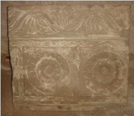 | Description / विवरण | architectural fragment, probably part of a wall, depicting two full bloomed lotus in niche. At the top and bottom of it, there are depiction of floral designs. |