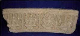 | Description / विवरण | architectural fragment, probably part of a circular panel, depicting four female deities having four arms. They all are sitting in Lalitasana on pedestal, in four niches and separated by pillars. The attributes are rubbed out. |