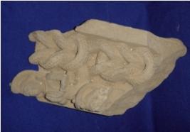 | Description / विवरण | Sculptured architectural fragment depicting two Naga Pratimas. The upper figurine is with folded hands and the figurines are coiled together. |