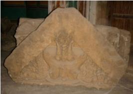 | Description / विवरण | architectural fragment probably Suknasa of a temple depicting a Kirtimukha in a triangular niche. The mouth of Kirtimukha is open and flames are depicted coming out from mouth. It has bulging eyes and prominent horns. |