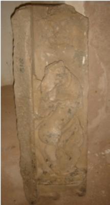| Description / विवरण | Sculptured architectural fragment probably part of a pillar, depicting a mythical animal in niche on high relief. Floral design are appearing from his tail. Above the figure there is the depiction of a human figure in flying position, probably a flying celestial. |