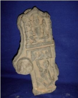 | Description / विवरण | Sculptured architectural fragment depicting four-armed Vishnu, seated in lalitasana in the upper niche, attributes from right below, 1. not clear 2. holding a mace 3. holding a lotus 4. not clear. He is wearing a crown and facial features are almost rubbed off. In the lower niche, a female dancing figurine is depicted. Her right leg is rubbed out. |