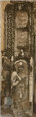 | Description / विवरण | Sculptured architectural fragment, depicting a female chauri bearer in standing pose and holding a chauri in the right hand and left hand resting over the thigh, placed in a pillared niche. Another female is depicted on her right side, standing and holding a flower in the right hand and a lotus stem, forming the shape of a canopy over her head, in the left hand. Both are wearing floral and pearl ornaments, large circular earrings, necklace, blouse, bracelets, the short lower garment having geometrical designs and tussles hanging up to the knees, and anklets. Above the chauri bearer, some female musicians are depicted. |
