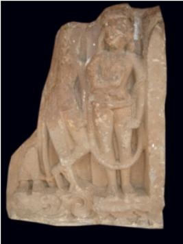 | Description / विवरण | architectural fragment depicting two male figurines in Kartavyalambit mudra, the upper portion of the figurine at right side is mutilated. Both the figurine s left hands are resting upon their thigh The right hand of the extreme left figurine is on its chest, he is wearing head gear and adorned with jewels like necklace, garland and round earrings, his drapery is seen up to the knee and his face is rubbed off. There is another figurine in the extreme right only feet portion is visible, upper portion is chopped off. |