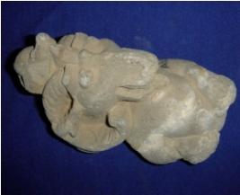 | Description / विवरण | architectural fragment depicting a mythical animal with prominent carved horn, bulging eyes, open mouth and the trunk is twisted out and the tusk is prominent. |
