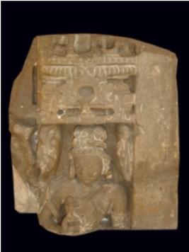 | Description / विवरण | Sculptured architectural fragment probably door jamb depicting the bust of a male figurine in the niche holding a lotus in right hand and left hand is seen up to the arm. He is wearing a jata mukuta, round earrings, necklace, sacred thread and armlet. Two architectural designs are seen at both the sides. On the upper portion of the niche some sculpture was there whose feet are only visible. |