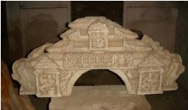 | Description / विवरण | Sculptured architectural fragment depicting a canopy of a shaivite temple, having arch design, on both sides of which, two Kirtimukha are depicted. At the top centre, navagrahas are depicted in lalitasana, except Rahu. Top of it, three headed Kartikeya is depicted sitting on his vahana peacock in lalitasana, in pillared niche. At both side of it, architectural designs are seen. At bottom of the canopy in both sides two female musicians, seated in lalitasana are depicted in pillared niche. Next to it, two makaras are depicted at the top of which two human figures are depicted, lying with crossed legs, the upper part of whose bodies are chopped off. |