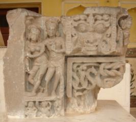 | Description / विवरण | Fragment of a door jamb depicting a standing couple in niche in high relief. Male is in left with a flower in his left hand. His right hand rests on shoulder of female at his right. Her right hand rests on her thigh, her left hand touches right arm. Both are adorned with elaborate headgear, beaded necklaces, round earrings bangles and girdles. Below them 3 celestial dancers are seen in niche. Left figure is almost mutilated, lower part of rest two figures is flaked off. At their left a Naga figure with broken head is seen in niche with coiled bodies. Above them a Kirtimukha is seen with protruding teeth, eyes and furious face. At its left a female figure is seen with lower part, left breast missing, elaborate headgear and adorned with jewels. She is holding something in right hand and her right breast is touched by a hand coming behind her body. |