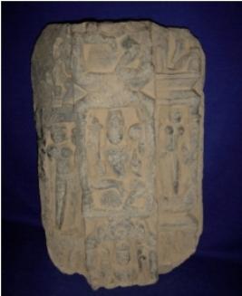 | Description / विवरण | fragment of a doorjamb, depicting three Vishnu in vertical row from top to bottom. The upper one is almost broken and so his attendants. In middle portion he is four armed. Attributes from right below 1 lotus 2 mace 3 chakra 4 conch. He is flanked by two female attendants. The lower Vishnu is broken from waist and 4 armed. Attributes from right below 1 conch 2 lotus 3 mace 4 missing. His attendants are broken off. |