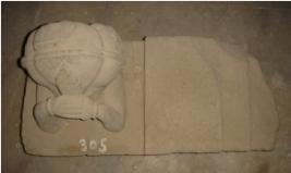 | Description / विवरण | Sculptured architectural fragment, depicting a Kirtimukha, holding a fish in both hands and devouring it in the open mouth with teeth. The left side has three stepped flat platforms. Part of mouth in left side is mutilated. |