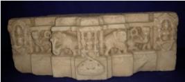 | Description / विवरण | Sculptured architectural fragment of pedestal of a Jaina Tirathankara kunthanath as it is having chakra in central bottom. In centre above chakra, goddess Indrani is depicted, seated in lalitasana, She is holding a pash in right hand and ankush in left hand. She is having two elephants on her both sides, and on the sides of elephants, two lions are depicted. On the extreme right, a male deity, probably Indra is depicted holing Shakti and ankush. |