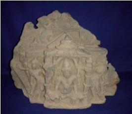 | Description / विवरण | Sculptured architectural fragment of canopy depicting four armed lord Brahma in a pillared niche in the centre. He is in Lalitasana. Attributes from right below 1 broken 2 clubs 3 manuscripts 4 water pot. He is flanked by 2 female attendants on either side. |