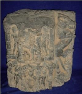 | Description / विवरण | Sculptured architectural fragment of doorjamb depicting a male deity with canopy, in the lower part of the fragment. He is flanked by 2 male attendants. On the top portion of the fragment, another deity in niche but missing flanked by two female attendants. On the left end of the fragment, an elephant head is depicted carrying vyala. |