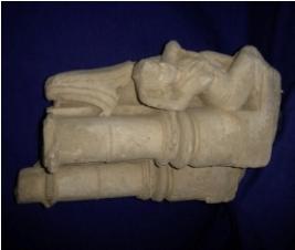 | Description / विवरण | Sculptured architectural fragment of Jharokha, depicting two pillars and in the left of the pillar, a woman is depicted in a seated pose. The face of women is mutilated but jewellery like necklace and earrings are clearly visible. Her left arm is broken but right is kept over her head. |