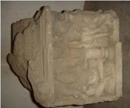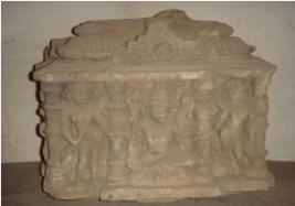 | Description / विवरण | Sculptured architectural fragment, carved from 3 sides. On the front side, Lord Shiva is depicted 4 armed in a pillared niche, he is seated in Lalitasana. Attributes from right below 1 vardana 2 tridents 3 snakes 4 water pot. He is flanked by two female attendants on either side. On the left part of the Shiva, a female deity is depicted with club held by both of her hands. She is flanked by a female attendant. On the right side of the Shiva, Lord Kubera is depicted seated in Lalitasana and 4 armed. Attributes from right below 1 Rosery 2 Money bag 3 Money bag 4 wine bowl. He is flanked by a female attendant. |