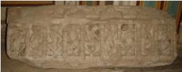 | Description / विवरण | Sculptured architectural fragment of a plinth of the temple, depicts nine celestial musicians and dancers, in a horizontal row and carved in a pillared niche. They all are dancing and playing musical instruments. |