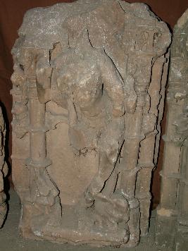 | Description / विवरण | It is an Fragment of Architecture member carved with a defaced female deity in high relief . Right leg of the figure is broken. Hands are also broken. The figure s body is decorated with ornaments. Neck and belly is heavily withered. There is figure of an animal under the feet. |