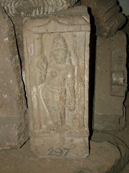 | Description / विवरण | It is an Fragment of Architecture member having female deity in tribhangi posture and an attendant holding a pot with left hand and one unidentified object with another hand. She is having conical shaped crown. Her breasts are ornamented but one of them is broken. She is shown bejeweled. |