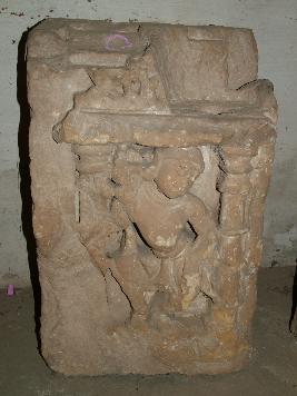 | Description / विवरण | It is an Fragment of Architecture member carved with a female deity in tribhangi posture. Right hand of the statue is chipped off and legs are partly broken. There are two chains neck. |