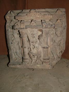 | Description / विवरण | This Fragment of Architecture member is carved with a female deity flanked by two female attendant on either side. The main deity holds a trident in her right hand and a pot like object in her left hand. They all are in tribhanga posture and placed in separate niches. |