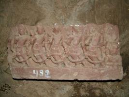 | Description / विवरण | It is an architectural fragment, decorated with 5 tribhanga sculpture, holding a kamandalu, while a demon like structure shown seated at the last on which a figure is shown sitting. |