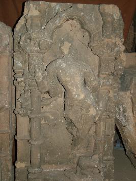 | Description / विवरण | It is an Fragment of Architecture member carved with a defaced male deity in high relief . Hands and legs of the deity are broken. It is decorated with ornaments and is placed in a minutely decorated niche. There is figure of an animal under the feet. |