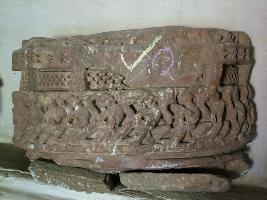 | Description / विवरण | This Fragment of Architecture member is carved with a human panel. They are in kneeling posture at the lower part, above it square cubes are carved. |