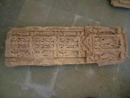 | Description / विवरण | This door Jamb is carved with four handed deity in standing posture. At the lower part a Jalamukutdhari male figure is flanked by two female figures. Above it there are three niches in which God and Goddess are carved and they are flanked by female figures of tribhangi posture. |
