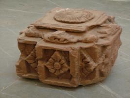 | Description / विवरण | It is an upper portion of a pillar, made of sandstone, which is having designs of diamond shaped, floral patterns. Also on the top portion it is having a designs which is similar to Amalikha. Besides, chisel marks designs are also noticeable in it. |