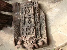 | Description / विवरण | It is an architectural fragment, decorated with various unclear attendants, carved horizontally in a niche with three large sculpture. The male one is flanked by two female. |