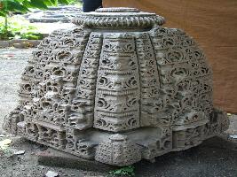 | Description / विवरण | This architectural piece is used as Anga Shikhara. This miniature temple is designed as North Indian temple style. It is carved with chaitya floral and cripple motifs. At the bottom part four small temple are carved at four corners. Ganesh is carved in one side other sides are also having figure of Gods at the bottom. As it is broken other side details are missing. At the top amlaka is carved. |