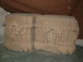 | Description / विवरण | This Fragment of Architecture member can be divided into two section and each section is having carved figures. Chaitya and floral designs. Among the figures most are female and they are in tribhangi posture. In each section one seated figure on pedestal can be seen. |