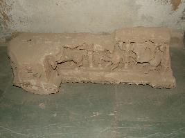 | Description / विवरण | It is an Fragment of Architecture member is carved with three horses with a warrior seated on them in three different niches. All horses are defaced. Horse is without rider. Decoration has been made in the lower part of the architectural member. |