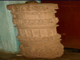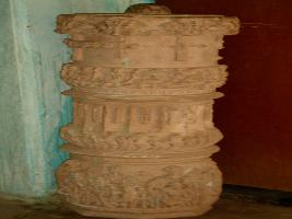 | Description / विवरण | Fragment of a pillar, carved as a drums joined together, upper part has carvings of mythical and religious figures like musicians and flying celestials, with garland in their hands, middle part has carving of vegetational motifs, while lower part has carving of demi God and Goddesses. |