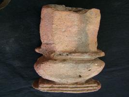 | Description / विवरण | This is a part of pillar which seems to be used in relling, made of terracotta. Front side is designed with two vertical ridge line, one prominent horizontal ridge. Middle section in having a bowl shaped design in which lower portion is square shaped with three prominent lines in horizontal pattern. |