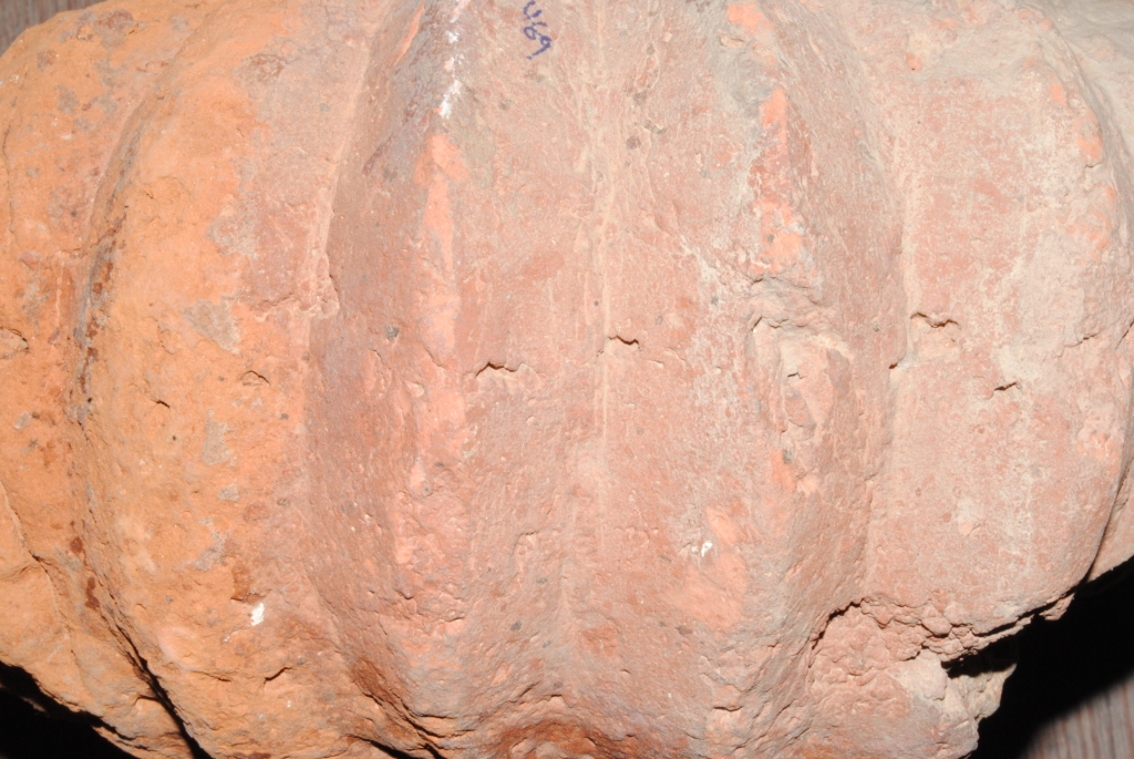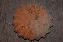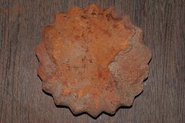 This is a brick made of terracotta and round shaped. It is well fired and colour is red. It may be used for making structure or decoration.There are some incised design on its surface. Surface is rough and flaked.