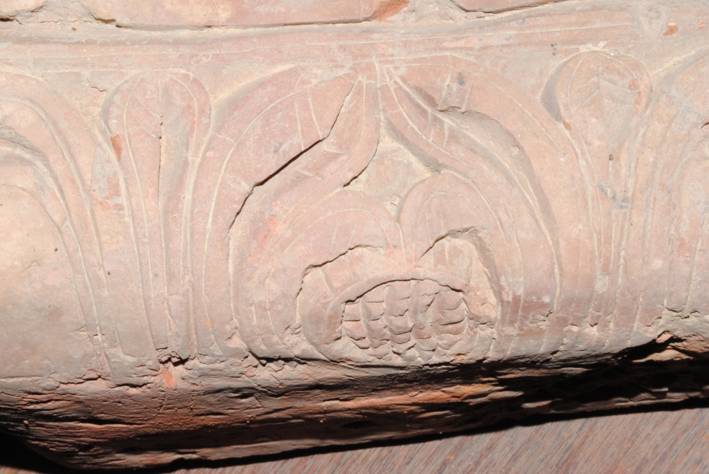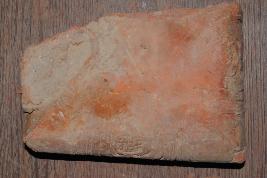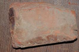 This is a brick made of terracotta. It is well fired and colour is red. It may be used for making structure or decoration.There are some incised design on its surface. Surface is rough and flaked.