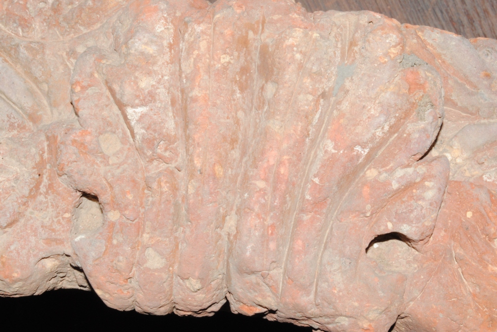 This is a brick made of terracotta. It is not well fired and colour is ochre. It may be used for making structure or decoration.There are some incised design on its surface. Surface is rough and flaked.