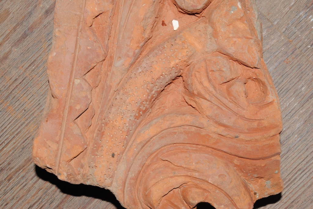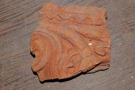 This is a brick made of terracotta. It is not well fired and colour is ochre. It may be used for making structure or decoration.There are some incised design on its surface. Surface is rough and flaked.