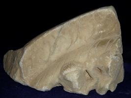| Description / विवरण | A piece of a stone probably a part of sculpture but cannot be identified. There is a decoration of flower design and faces of two human figure are at the side. |