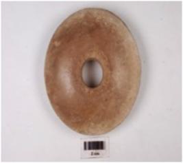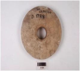 | Description / विवरण | An architectural member made of chert, biconvex shaped and perforated. |