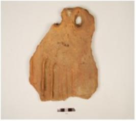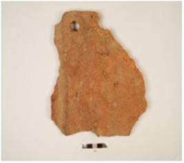 | Description / विवरण | Tile with two perforation at top, one perforation broken, five groove channel on surface on one side, flat on both surface and rectangular cross section. |